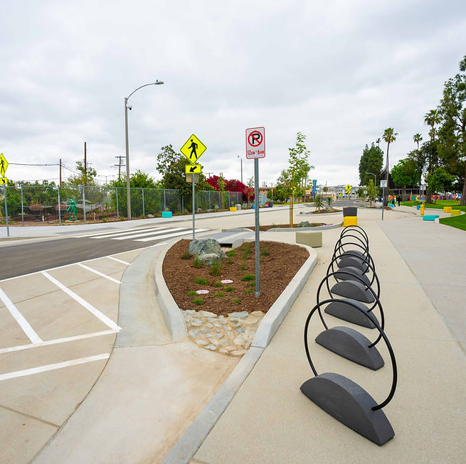 The La Palma Park Way Promenade transforms underused streets into a safe, green gateway to La Palma Park. Funded through the Clean California program, the project adds walkways, crosswalks, bike access, shade trees, stormwater capture, and public art, creating a vibrant community space for residents. The project improves daily life for residents by creating safer walking and biking routes, adding shade trees, and expanding access to recreation and community services. Green infrastructure and public art help create a cooler, cleaner, and more welcoming neighborhood space.