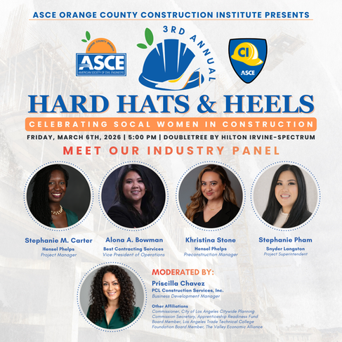 In honor of the National Women in Construction Week 2026, the ASCE Orange County Construction Institute is excited to host its third annual "Hard Hats & Heels: Celebrating SoCal Women in Construction" event! Join us on Friday, March 6th, 2026, at the DoubleTree by Hilton Hotel Irvine-Spectrum for an engaging evening featuring panel discussions, networking, and scholarship awards with exceptional students and professionals from Southern California.
